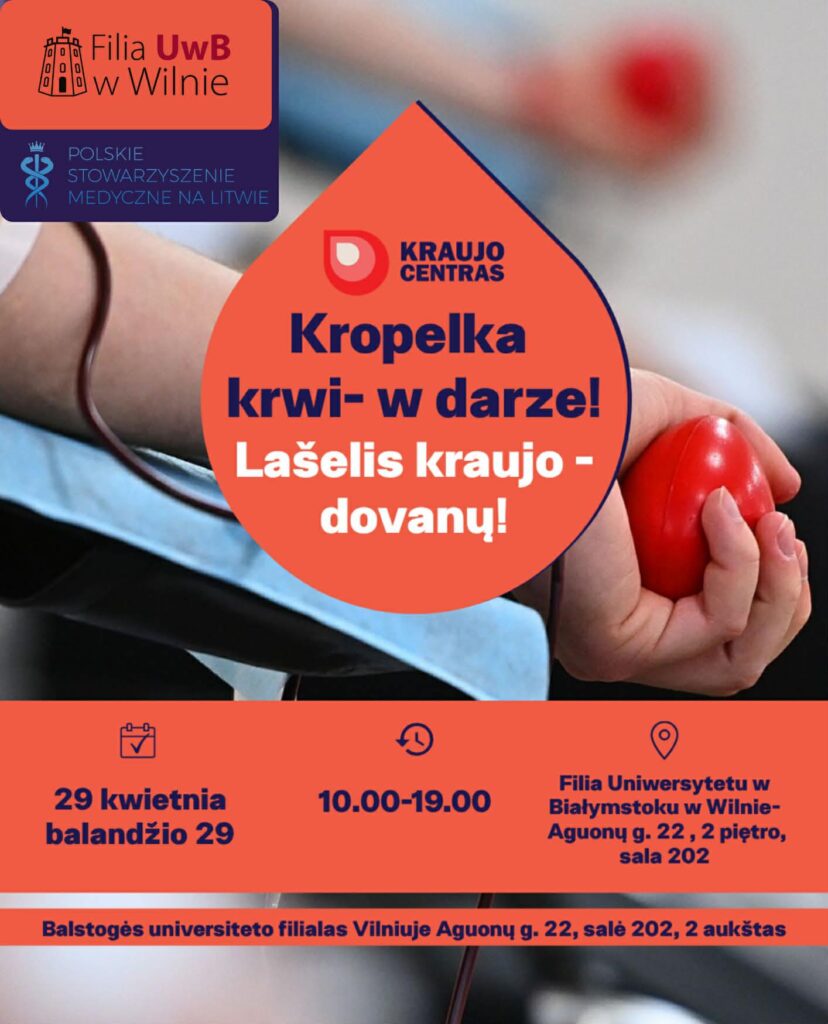 w imieniu Polskiego Stowarzyszenia Medyków na Litwie (PSML) we współpracy z Wileńskim Centrum Krwiodawstwa zapraszamy do udziału w dobroczynnej akcji oddawania krwi.