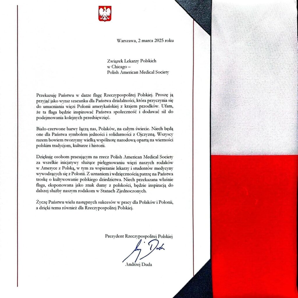 Z ogromną dumą i wdzięcznością Związek Lekarzy Polskich w Chicago (Polish-American Society in Chicago (Związek Lekarzy Polskich w Chicago) otrzymało flagę Rzeczypospolitej Polskiej z rąk Prezydenta Andrzeja Dudy jako wyraz uznania za niezachwiane zaangażowanie i oddanie na rzecz polskiej społeczności.